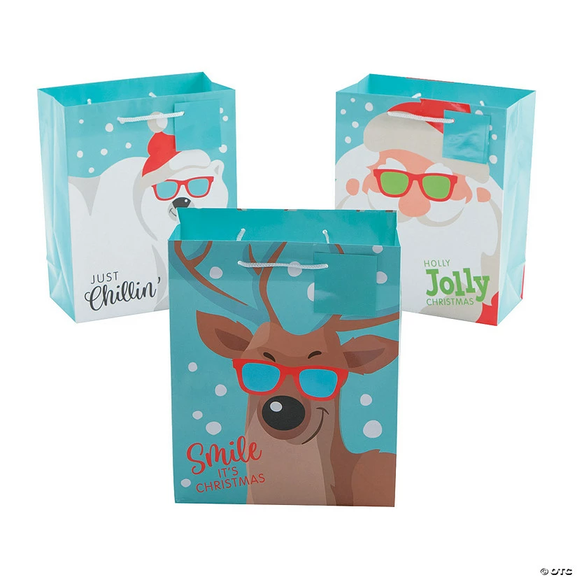 โข Reusable: Go green with this eco-friendly gift bag! They could even be reused for future gifts.โข Easy Gift Wrapping: These sturdy gift bags are suitable for holding a variety of presents and come with easy-to-carry handles. They make wrapping any gift easy breezy!โข Quality: These stylish gift bags are sure to make your present stand out from the pack. Just add some tissue paper for a beautiful gift presentation!Product Description:Help everyone have a holly jolly Christmas with these adorable gift bags. Perfect for handing out gifts to co-workers, students and friends, these gift bags are festive and fun! Each bags has a cool Christmas character including Santa in shades, a polar bear and a smirky reindeer in shades. These cool characters are ready to help you give out some gifts to spread the Christmas spirit! Paper. 7 1/4″ x 3 1/2″ x 9″ with 4″ handles. ยฉ OTCSize: 7 1/4″ x 9″Quantity: 12Material: Paper.