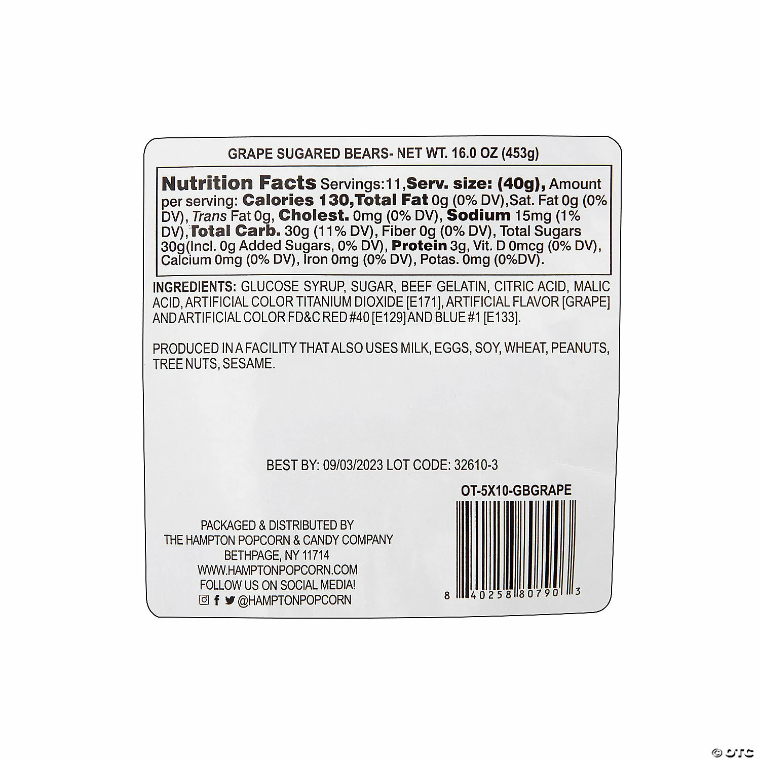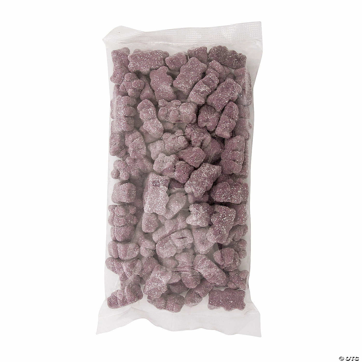No candy buffet or goody bag is complete without these sugary sweet gummy bears! Pick your favorite flavor and watch guests gobble up these cute candies with gusto. These bears will look great amidst other candies on a treat table at your next wedding reception, anniversary party, bridal shower or graduation. Grape flavor. (Approx. 100 pcs. per unit) Dairy-Free. Fat-free. Nut-free. Total wt., 1 lb.โข Candy is non-returnable. For more information, visit our โReturn Policyโ page located on our website. โข Made in the USA. Important Country of Origin Information: For certain items sold by OTC on our Web or Mobile sites, country of origin information can change and what is displayed may not be accurate or consistent with manufacturer information. For up-to-date country of origin information, it is recommended that you rely on product packaging or other manufacturer information.โข Ingredient, nutrition, allergen and other product information are provided on our Web and Mobile sites for reference purpose only, without warranty or representation as to accuracy. Manufacturers adjust their labeling regularly and are solely responsible for the accuracy of the information. For general questions concerning these items, please contact our customer service at 800-228-0475.