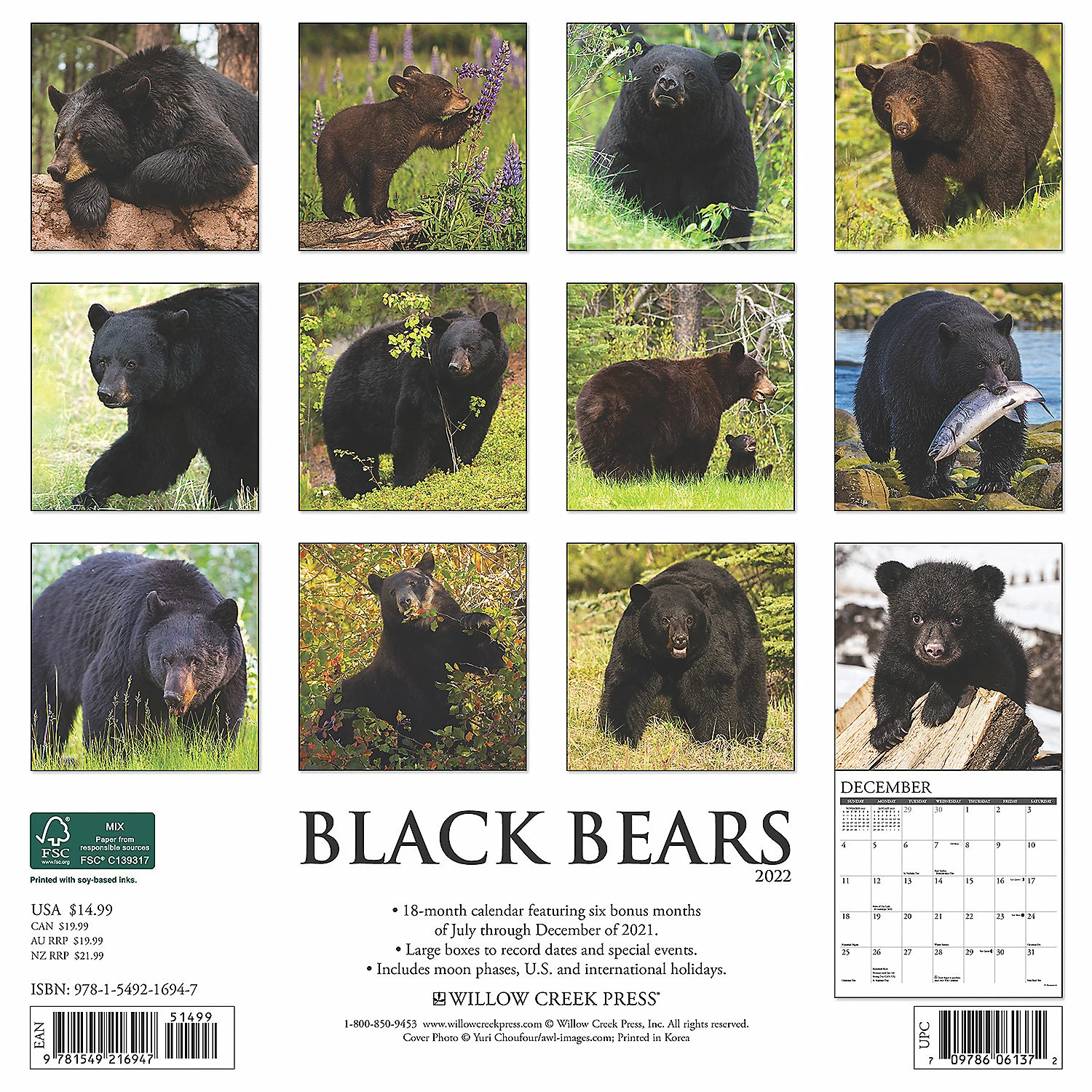 The highly adaptable and secretive black bear ranges throughout North America including at least 40 of the United States. These twelve superb full color photographs feature black bears in their natural environment. Printed with soy-based inks on FSC certified paper, this 12″ x 12″ wall calendar features large monthly grids that offer ample room for jotting notes, along with six bonus months of July through December of 2021. Also includes moon phases (CST), standard U.S. and international holidays.